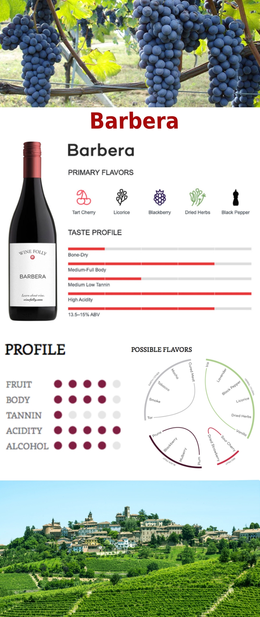 Các vùng sản xuất rượu vang Barbera trên thế giới Đặc điểm của nho Barbera Là một giống nho chín muộn, thường chín muộn hơn khoảng hai tuần so với Dolcetto, một giống nho đỏ khác của Piedmont, nhưng vẫn sớm hơn Nebbiolo. |