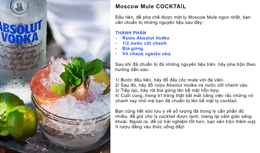 Điểm đặc biệt là nước dùng để pha chế loại rượu này được lấy từ các khu vực giếng sâu tại Aahus, ít pha lẫn tạp chất khác. Chính vì độ tinh khiết này, Absolut Vodka được thưởng thức theo nhiều cách như dùng để pha chế cocktail, uống neet. Moscow Mule COCKTAIL Đầu tiên, để pha chế được một ly Moscow Mule ngon nhất, bạn cần chuẩn bị những nguyên liệu sau đây: THÀNH PHẦN - Rượu Absolut Vodka - 1/2 nước cốt chanh - Bia gừng - Vỏ chanh nghiền nhỏ Sau khi đã chuẩn bị đủ những nguyên liệu trên, hãy pha trộn theo hướng dẫn sau: 1/ Bước đầu tiên, hãy đổ đầy cốc mule với đá viên. 2/ Sau đó, hãy đổ rượu Absolut Vodka và nước cốt chanh vào. 3/ Tiếp tục, hãy rót bia gừng lên bề mặt hỗn hợp. 4/ Cuối cùng, trang trí trông thật bắt mắt bằng việc rắc những vỏ chanh xay nhỏ mà bạn đã chuẩn bị lên bề mặt ly cocktail. Bạn cũng hết sức lưu ý về số lượng đá trong ly cần phần đủ nhiều, để giữ cho ly cocktail được lạnh, mang lại cảm giác sảng khoái. Ngoài ra, để có trải nghiệm tốt hơn, bạn nên trộn thêm một ít rượu đắng vào thức uống đấy! |