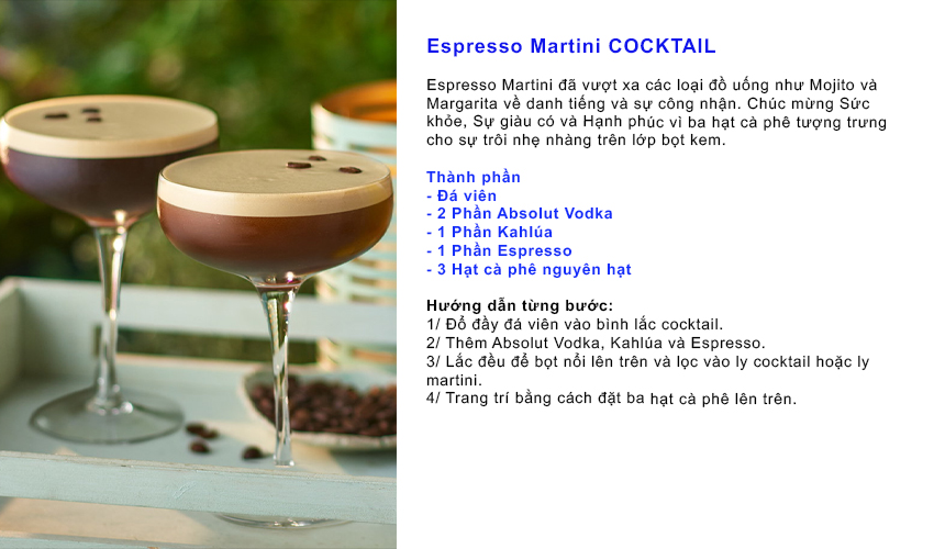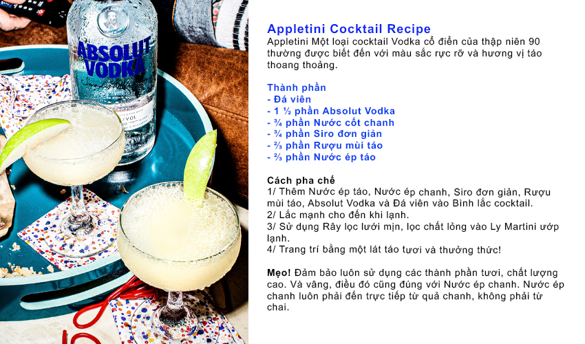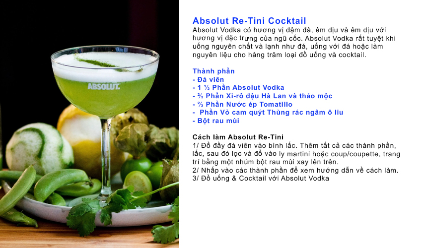 Absolut Re-Tini Cocktail Từ những thức uống đơn giản chỉ gồm hai thành phần đến hỗn hợp phức tạp của các loại thảo mộc, trái cây, gia vị và nhiều thứ khác, có rất nhiều cách để pha chế một loại cocktail ngon với rượu vodka. Dưới đây, chúng tôi sẽ chia sẻ các công thức pha chế cocktail rượu vodka yêu thích của chúng tôi mà bạn có thể dễ dàng thực hiện tại nhà. Thành phần Cách làm Absolut Re-Tini Từ những thức uống đơn giản chỉ gồm hai thành phần đến hỗn hợp phức tạp của các loại thảo mộc, trái cây, gia vị và nhiều thứ khác, có rất nhiều cách để pha chế một loại cocktail ngon với rượu vodka. Dưới đây, chúng tôi sẽ chia sẻ các công thức pha chế cocktail rượu vodka yêu thích của chúng tôi mà bạn có thể dễ dàng thực hiện tại nhà. Chúng chắc chắn sẽ khiến bạn bè của bạn (và chính bạn nữa!) phải trầm trồ.