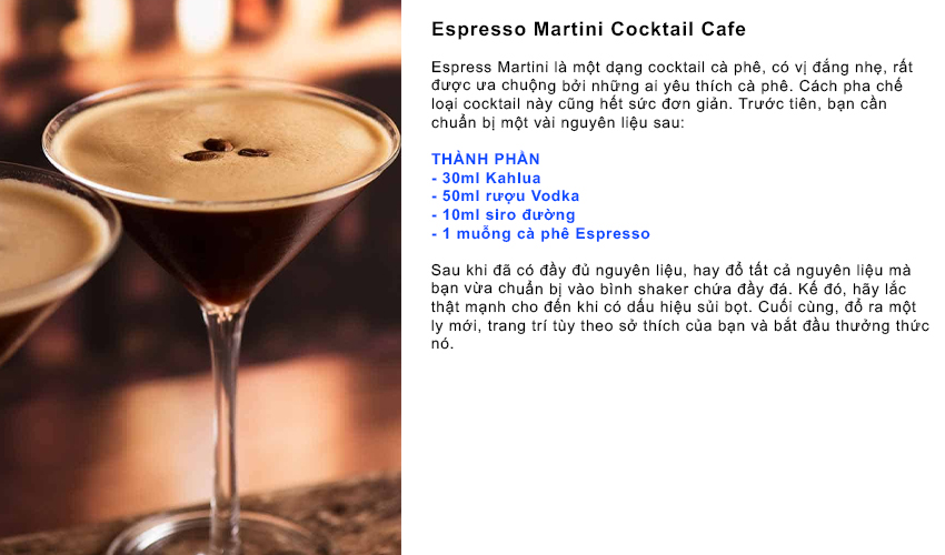 Espresso Martini COCKTAIL THÀNH PHẦN Sau khi đã có đầy đủ nguyên liệu, hay đổ tất cả nguyên liệu mà bạn vừa chuẩn bị vào bình shaker chứa đầy đá. Kế đó, hãy lắc thật mạnh cho đến khi có dấu hiệu sủi bọt. Cuối cùng, đổ ra một ly mới, trang trí tùy theo sở thích của bạn và bắt đầu thưởng thức nó. |