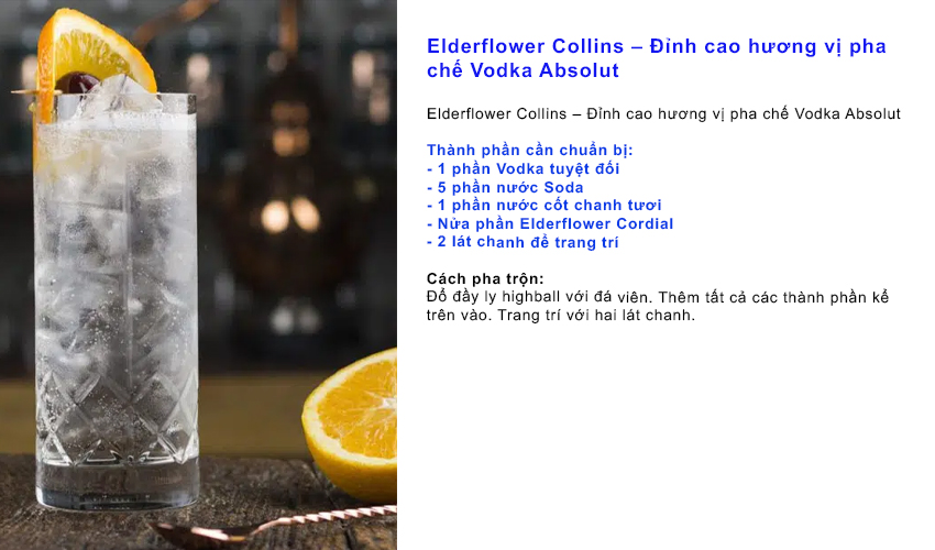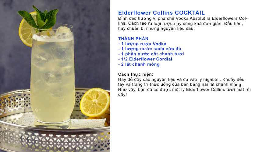 Elderflower Collins – Đỉnh cao hương vị pha chế Vodka Absolut Thành phần cần chuẩn bị: Cách pha trộn:
