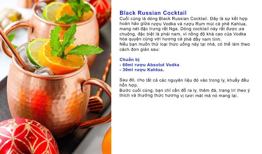 Black Russian Cocktail Nếu bạn muốn thử loại thức uống này tại nhà, có thể làm theo cách đơn giản sau: THÀNH PHẦN