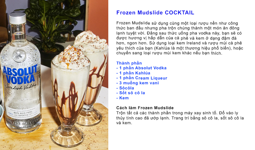Frozen Mudslide COCKTAIL Frozen Mudslide sử dụng cùng một loại rượu nền như công thức ban đầu nhưng pha trộn chúng thành một món ăn đông lạnh tuyệt vời. Đằng sau thức uống pha vodka này, bạn sẽ có được hương vị hấp dẫn của cà phê và kem ở dạng đậm đà hơn, ngon hơn. Sử dụng loại kem Ireland và rượu mùi cà phê yêu thích của bạn (Kahlúa là một thương hiệu phổ biến), hoặc chuyển sang loại rượu mùi kem khác nếu bạn thích. Thành phần